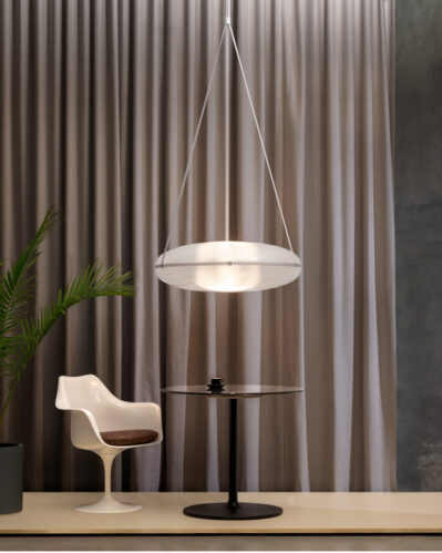 Een caleidoscopisch licht verspreidt zich vanuit de bolvormige lichtbron van de Iris, die zich uitstrekt voorbij het kristalheldere oppervlak. Omgeven door een elliptische schil, vertoont de Iris een gewichtloosheid die hem een luchtige uitstraling geeft. Volumineus en uitgestrekt, komt hij een ruimte binnen met een opvallende schaal.