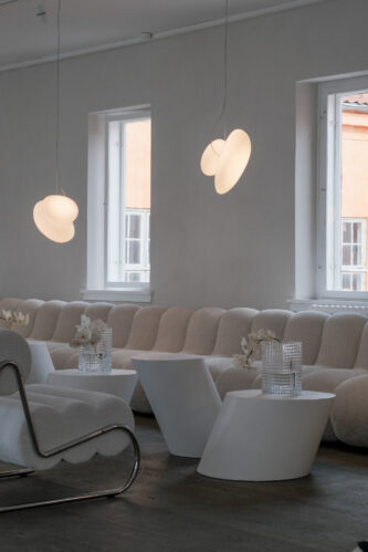De Pebble-serie viert de oeroude schoonheid van stenen. Door hun eenvoudige maar sculpturale vorm te versterken door middel van doorschijnendheid, gaan twee glasgeblazen vormen een dialoog aan. Het resultaat is een schijnbaar op maat gemaakte hanglamp die eindeloos in vorm evolueert wanneer bekeken vanuit verschillende perspectieven.