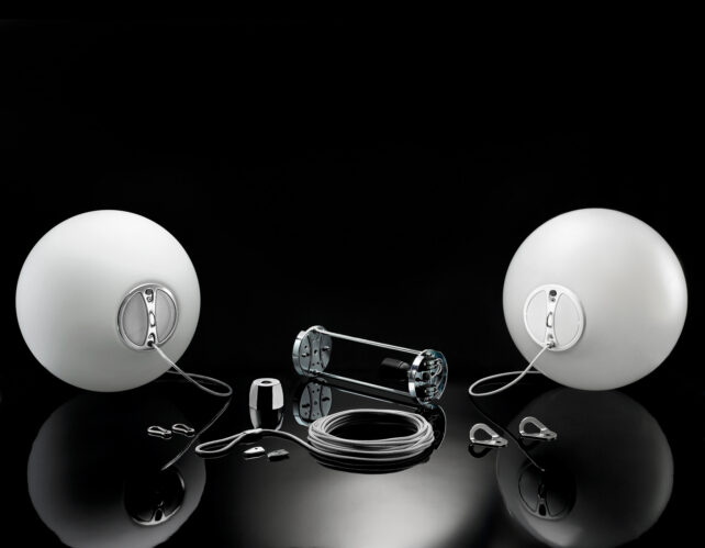 Een eenvoudige bol vormt het belangrijkste element van dit verlichtingssysteem, dat gecombineerd kan worden met plafondrozetten, ankers en ophangkabels. Perla wordt geleverd met een geblazen glazen bolvormige diffuser en kan afzonderlijk of in talloze composities worden gebruikt. Deze hanglamp van gegoten aluminium met een geblazen glazen diffuser is verkrijgbaar in 2 maten: Ø28 cm of Ø35 cm. Het interne frame is ontworpen voor een trekkracht tot 50 kg (Lumina patent). Dankzij de stalen constructie kan Perla in elke gewenste positie worden verankerd, zelfs decentraal ten opzichte van de stroombron.