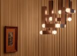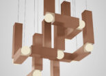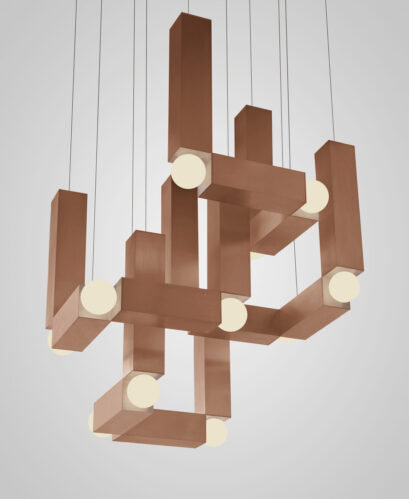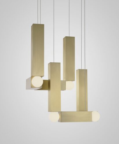 Vesper is geïnspireerd op de eenvoudige geometrische lijnen van brutalistische sculpturen en modernistische kathedraalverlichting. Gemaakt van geëxtrudeerd aluminium en verkrijgbaar in geanodiseerd goud of zilver, onderzoekt Vesper het delicate evenwicht en de onderlinge verbondenheid van de rechthoekige kubussen die naadloos met elkaar verbonden zijn door verlichte bollen. De lichtsculptuur, die aan kabels hangt, is verkrijgbaar in een Duo- en een Quattro-versie.